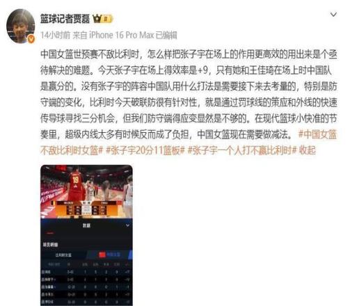 京媒則聚焦于內(nèi)線表現(xiàn)失常,直言韓旭與李月汝作為國內(nèi)最具統(tǒng)治力的兩名內(nèi)線,此役卻集體迷失:韓旭全場(chǎng)11投3中僅得7分,李月汝7次出手僅2球命中,合計(jì)13分,面對(duì)比利時(shí)平均身高1米93、機(jī)動(dòng)性極強(qiáng)的內(nèi)線群,完全未能兌現(xiàn)預(yù)期壓制力。