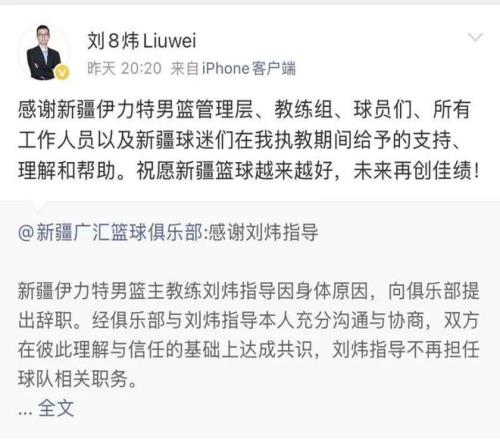 隨后,劉煒轉(zhuǎn)發(fā)該博文,并表示:“感謝新疆伊力特男籃管理層、教練組、球員們、所有工作人員以及新疆球迷們在我執(zhí)教期間給予的支持、理解和幫助。祝愿新疆籃球越來越好,未來再創(chuàng)佳績!”