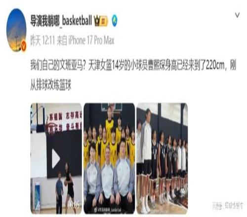 然而,近日,根據(jù)知情人士透露,中國女籃又冒出一個2米20的天才大個子了。據(jù)悉,這名天才中鋒來自于天津女籃,名字為曹熙琛,今年只有14歲,但身高已經(jīng)長到了2米20。而且,根據(jù)該知情人士透露,曹熙琛原先并不是練籃球的,在進入到籃球項目之前,她是學(xué)習(xí)排球的。只不過,由于后來身高長得非???,最終不得不放棄排球,轉(zhuǎn)而練起了籃球。