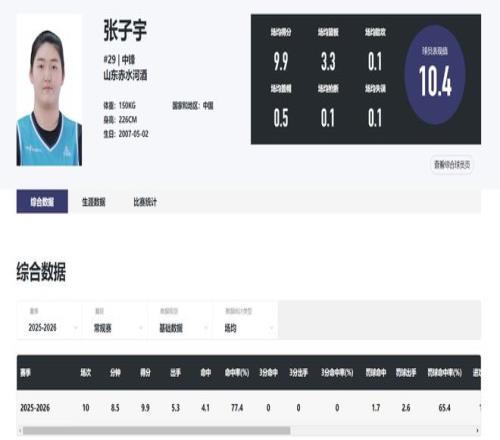 目前張子宇在WCBA場均8.5分鐘,拿到9.9分3.3籃板0.1助攻0.1搶斷0.5蓋帽,命中率77.4%,雖然登場時間少但效率值非常之高,18歲已經(jīng)2.26米的張子宇就是女籃的核武。