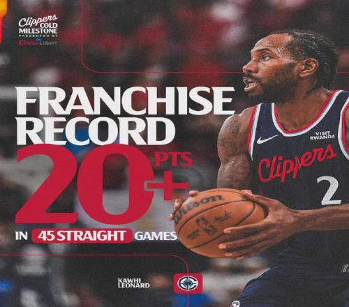 倫納德盡管只打了不到26分鐘,可出手23次中13球砍下31分6板2斷,已經(jīng)連續(xù)45場比賽得分20+創(chuàng)造快船隊史最長紀錄,之前該紀錄保持者為1972年榜眼秀鮑勃-麥卡杜。