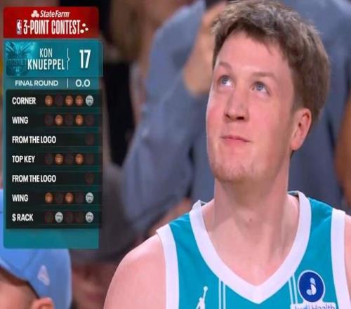 進(jìn)入決賽比拼,黃蜂新秀克努佩爾率先登場,他第一個點命中4球包括花球,左側(cè)弧頂5中2,隨后超遠(yuǎn)球不中??伺鍫栔新坊№斠仓幻?球,超遠(yuǎn)球繼續(xù)不中,右側(cè)弧頂命中3球,最后一個弧頂花球只命中2球,最終只得到17分遠(yuǎn)遜色于預(yù)賽的發(fā)揮。