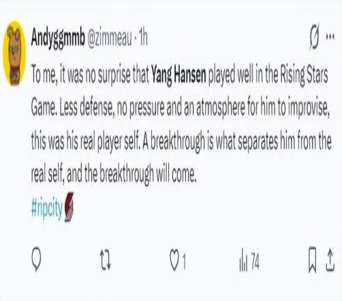 拓媒Ripcityy也發(fā)聲祝賀楊瀚森在全明星賽起飛。