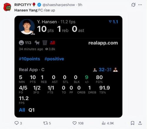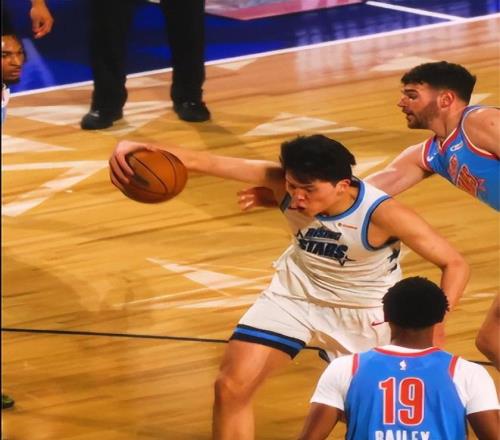 NBA全明星新秀賽,中國球員楊瀚森代表安東尼隊登場一次,全場比賽8分鐘,5中4,三分2中1,拿到10分2籃板0失誤,命中率80...