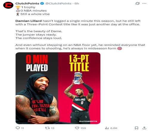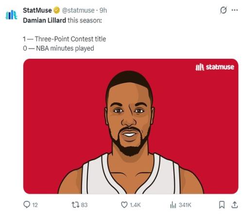 除此之外利拉德還創(chuàng)造了一項NBA歷史首人紀錄,他在本賽季還未出戰(zhàn)過任何一分鐘,卻拿到了三分大賽的冠軍,他是歷史首位做到的NBA球員。