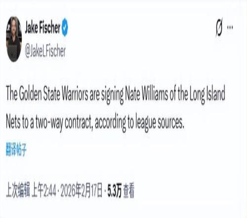 北京時間2月17日,據(jù)NBA名記Fischer報道,勇士將與內(nèi)特-威廉姆斯簽下一份雙向合同。這位球員又名吉納森-威廉姆...