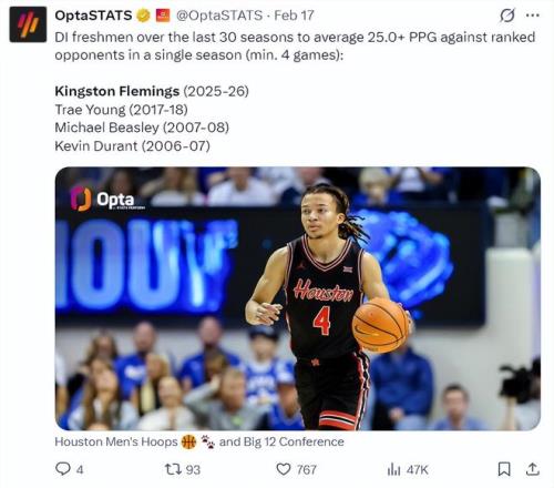 根據(jù)數(shù)據(jù)媒體OptaStats的消息,在過去30個賽季中,大一新生在對陣聯(lián)盟排名靠前球隊時能場均達到25分的球員只有特雷楊17-18、比斯利07-08賽季、杜蘭特06-07賽季、弗萊明斯25-26賽季。