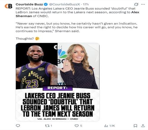 但兩小時(shí)后根據(jù),美記alex sherman的報(bào)道,湖人隊(duì)CEO珍妮-巴斯覺得勒布朗‘不太可能’會(huì)在下賽季重返湖人隊(duì)。雖然不能說詹姆斯絕對(duì)不會(huì)重返LAL,但珍妮-巴斯透露詹姆斯從來沒有任何暗示將要重返湖人,詹姆斯對(duì)自己的職業(yè)生涯有絕對(duì)的控制權(quán)。