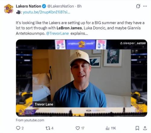根據(jù)湖人記者Trevor Lance的分析,湖人隊(duì)今夏會(huì)迎來一個(gè)輝煌的夏天,他們需要處理好詹姆斯的合同,東契奇、揚(yáng)尼斯的潛在合作也是一個(gè)契機(jī)。Trevor Lance也認(rèn)為今夏詹姆斯有離隊(duì)的可能性,因?yàn)楹岁?duì)會(huì)要求詹姆斯接受大幅度的降薪,甚至希望詹姆斯接受老將底薪,這樣才能交易、先簽后換一個(gè)超級(jí)巨星。
