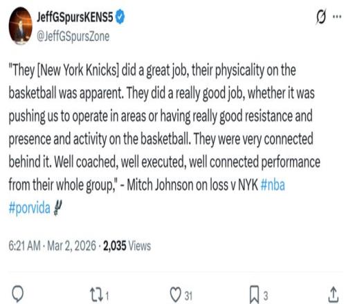 賽后馬刺主帥米奇也稱贊道:“本場(chǎng)他們表現(xiàn)出色,進(jìn)攻端身體對(duì)抗強(qiáng)度極高,迫使我們不得不改變防守策略,防守端也展現(xiàn)出極強(qiáng)的韌性、存在感與積極性,總而言之,他們攻防做得都非常出色,團(tuán)隊(duì)配合默契,這是一場(chǎng)訓(xùn)練有素、執(zhí)行到位、配合默契的精彩比賽?!?/p>