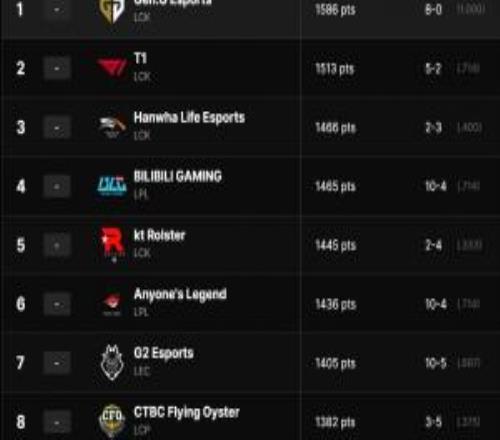 GEN.G/T1/HLE位列前三,LPL冠軍BLG第四,AL第六,LPL亞軍JDG僅排第九,TES第十。