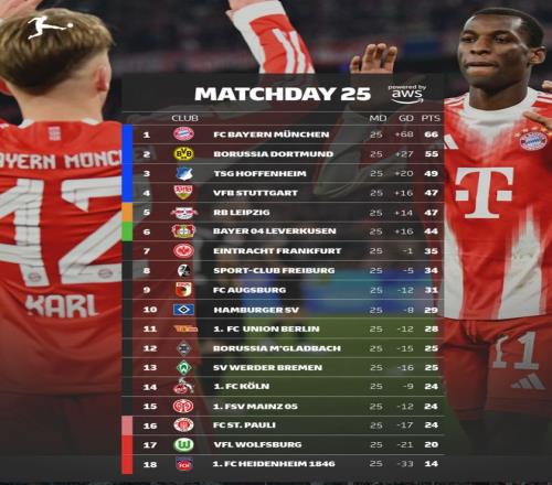 德甲第25輪綜述:拜仁5連勝+11分領跑,狼堡8輪不勝深陷降級區(qū)