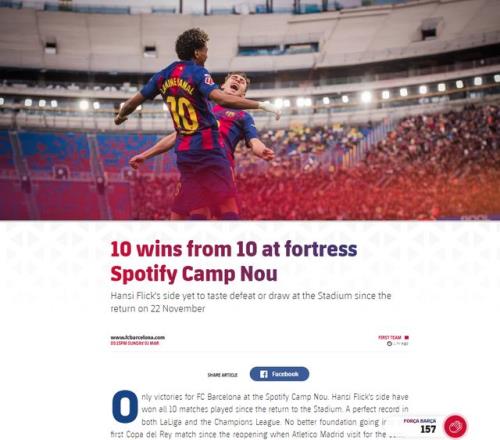 新諾坎普球場(chǎng)是巴薩的福地,巴薩官方統(tǒng)計(jì)本賽季回歸之后,球隊(duì)打出的主場(chǎng)10連勝: