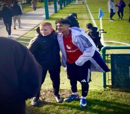 球迷和JJ加布里埃爾在U18曼市德比賽后合影,本場(chǎng)比賽加布里埃爾打入1個(gè)進(jìn)球,球隊(duì)3-1擊敗曼城。