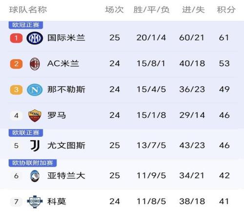 全場(chǎng)比賽結(jié)束,國(guó)米3-2絕殺擊敗尤文,豪取意甲6連勝。此役過(guò)后,藍(lán)黑軍團(tuán)25輪積61分穩(wěn)居意甲榜首,第二名米蘭少賽一輪積53分,領(lǐng)先多達(dá)8分,聯(lián)賽爭(zhēng)冠格局愈發(fā)明朗!