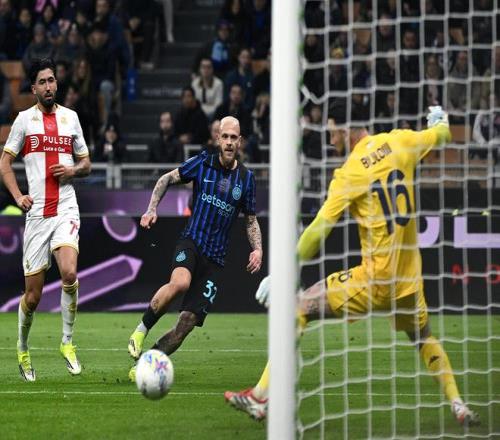 開(kāi)場(chǎng)后,國(guó)米展現(xiàn)出了實(shí)力上的巨大優(yōu)勢(shì),而且率先利用定位球制造威脅,前15分鐘就有德弗里和阿坎吉在角球進(jìn)攻中制造出射門(mén)機(jī)會(huì)。之后,國(guó)米又在運(yùn)動(dòng)戰(zhàn)中發(fā)力,第16分鐘博尼在禁區(qū)內(nèi)抽射卻被對(duì)方門(mén)將神勇?lián)涑?,?6分鐘姆希塔良禁區(qū)外的遠(yuǎn)射碰到防守球員發(fā)生折射后擊中橫梁,而在第31分鐘又是博尼禁區(qū)內(nèi)的頭球攻門(mén)被門(mén)將拒之門(mén)外。這三次射門(mén)都極具威脅,但奈何對(duì)方門(mén)將和梅阿查的橫梁都有發(fā)揮,球隊(duì)也一直沒(méi)能破僵。