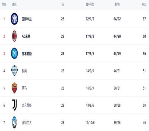 在積分榜上,國際米蘭依然占據(jù)榜首位置。國際米蘭22勝1平5負,拿到67分。AC米蘭贏球之后,總積分達到60分,排名第2。這場勝利讓AC米蘭沖擊冠軍看到了希望,畢竟差距縮小了,只落后7分。如果這場焦點戰(zhàn)AC米蘭落敗的話,差距會達到13分,但事實是AC米蘭贏下來了,讓冠軍爭奪依然有懸念。那不勒斯以56分排名第3。第4的是科莫,拿到51分。落敗的羅馬依然是51分,排名第5。尤文圖斯以50分排名第6。