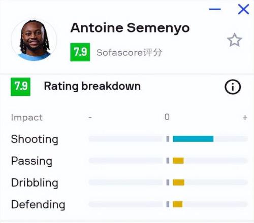 第二是“邊前鋒”屬性,彌補曼城短板。 曼城此前進(jìn)攻端過度依賴哈蘭德的問題時有顯現(xiàn)。當(dāng)挪威射手被針對性限制時,球隊往往缺乏第二穩(wěn)定得分點。多庫擅長突破創(chuàng)造機會,但射門效率和進(jìn)球轉(zhuǎn)化率有限。塞梅尼奧的到來正好彌補了這一短板的,他既能在邊路利用1米85的身材和出色爆發(fā)力完成突破,又能適時內(nèi)收扮演第二得分手。這種“邊前鋒”雙屬性,讓曼城的進(jìn)攻體系更加多元。
