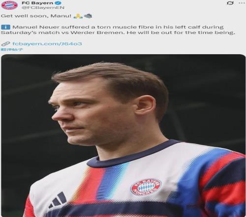 官方:拜仁宣布諾伊爾在周六對(duì)不萊梅的比賽中左小腿肌肉纖維撕裂,他將缺陣一段時(shí)間。