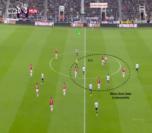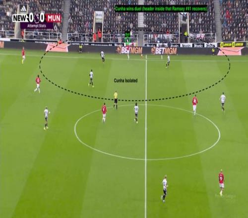 下半場(chǎng),庫(kù)尼亞被安排回撤,并且到更靠左的位置接球。他成功跑位接應(yīng)布魯諾·費(fèi)爾南德斯的直塞,博得了扳平比分的點(diǎn)球。