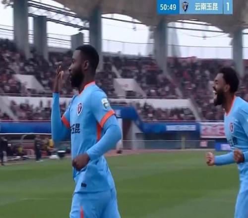 第50分鐘,云南玉昆發(fā)動(dòng)一次快速反擊,約尼查頭球擺渡,奧斯卡一腳凌空爆射破門,1-1!