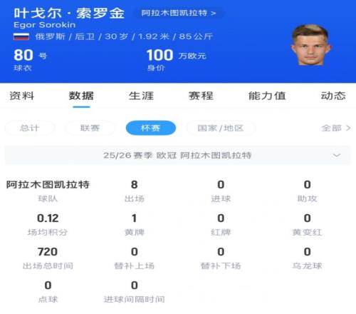 數據顯示,索羅金此前效力于阿拉木圖凱拉特俱樂部,并且一直擔任主力中衛(wèi)。本賽季,索羅金已經踢了8場歐冠資格賽和8場歐冠正賽,他的解圍和高空對抗能力比較突出,算得上是一名不折不扣的歐冠級球員。