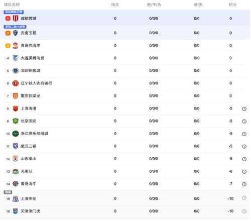 與以往賽季相比,新賽季中超的最大不同在于9支球隊負(fù)分開局。上海申花、天津津門虎均被扣10分,青島海牛被扣7分,山東泰山、河南均被扣6分,上海海港、北京國安、浙江、武漢三鎮(zhèn)均被扣5分。多支傳統(tǒng)強隊未戰(zhàn)先背“積分包袱”。