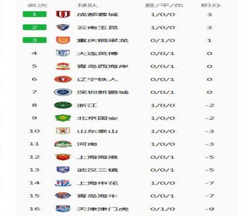 從0分打起的成都蓉城大勝深圳新鵬城之后,凈勝球4個(gè),積3分,領(lǐng)跑聯(lián)賽積分榜,展現(xiàn)中超爭(zhēng)冠實(shí)力。另一支從0分打起的云南玉昆3-1擊敗青島海牛,與成都蓉城同積3分,在積分榜排名第二。重慶銅梁龍客場(chǎng)0-0戰(zhàn)平天津津門虎,升班馬斬獲隊(duì)史中超首分,在積分榜排名第三。