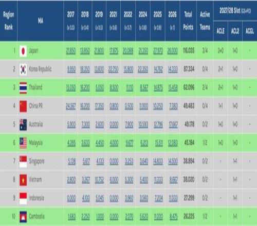 中超本賽季亞冠技術積分滑落至東亞區(qū)第10位,被柬埔寨超越
